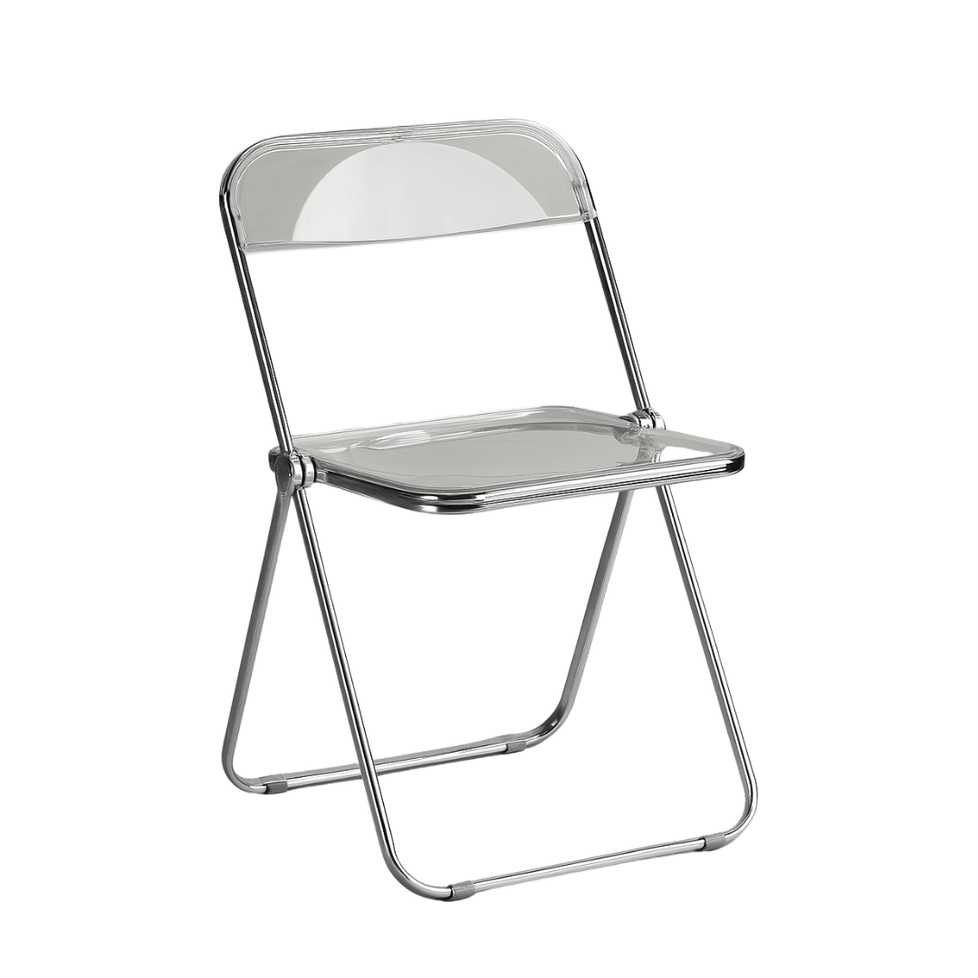 Clean geometry meets subtle curvature in this design-led folding chair. The translucent acrylic seat and backrest give it a floating, architectural feel; a quiet statement that pairs effortlessly with any interior palette.