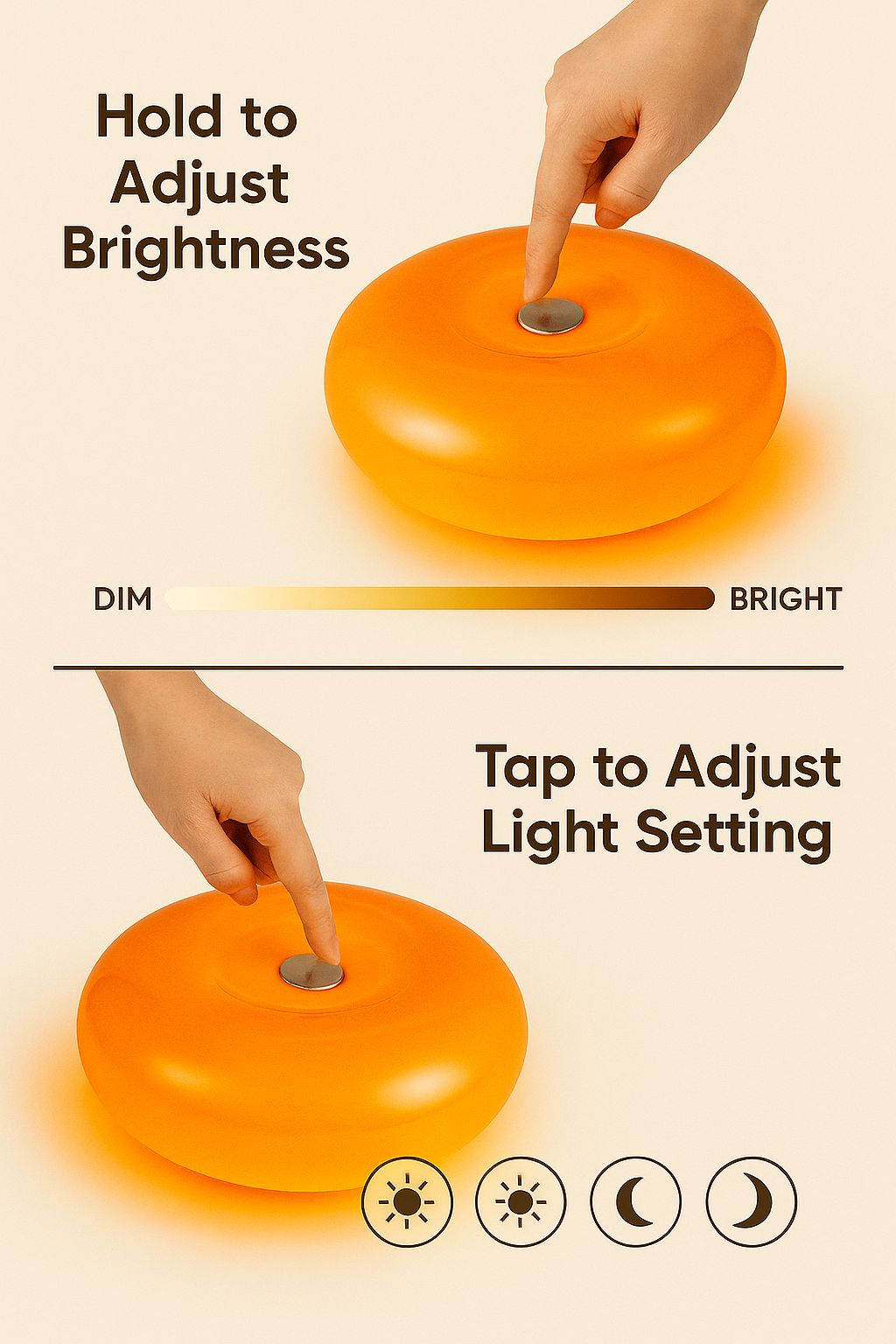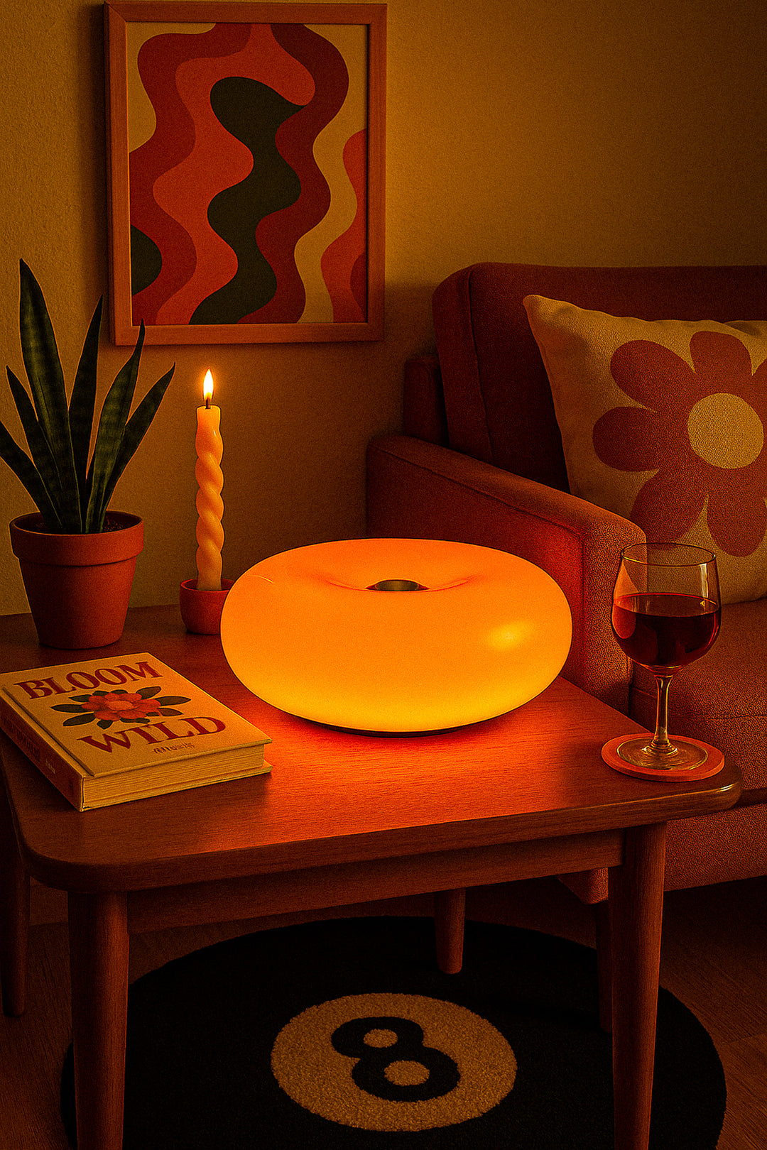 The Donut Lamp brings sculptural softness to your space. With its rounded design and soft orange glow, it evokes the comfort of golden hour lighting — perfect for winding down, hosting, or creating a calm atmosphere that doesn’t rely on harsh overhead lights.